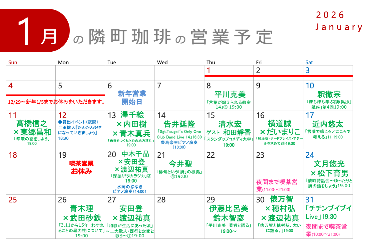 隣町珈琲ではイベント、講座、会合、撮影、パーティー、ミニライブなど多様な目的でお店をご利用いただけます。