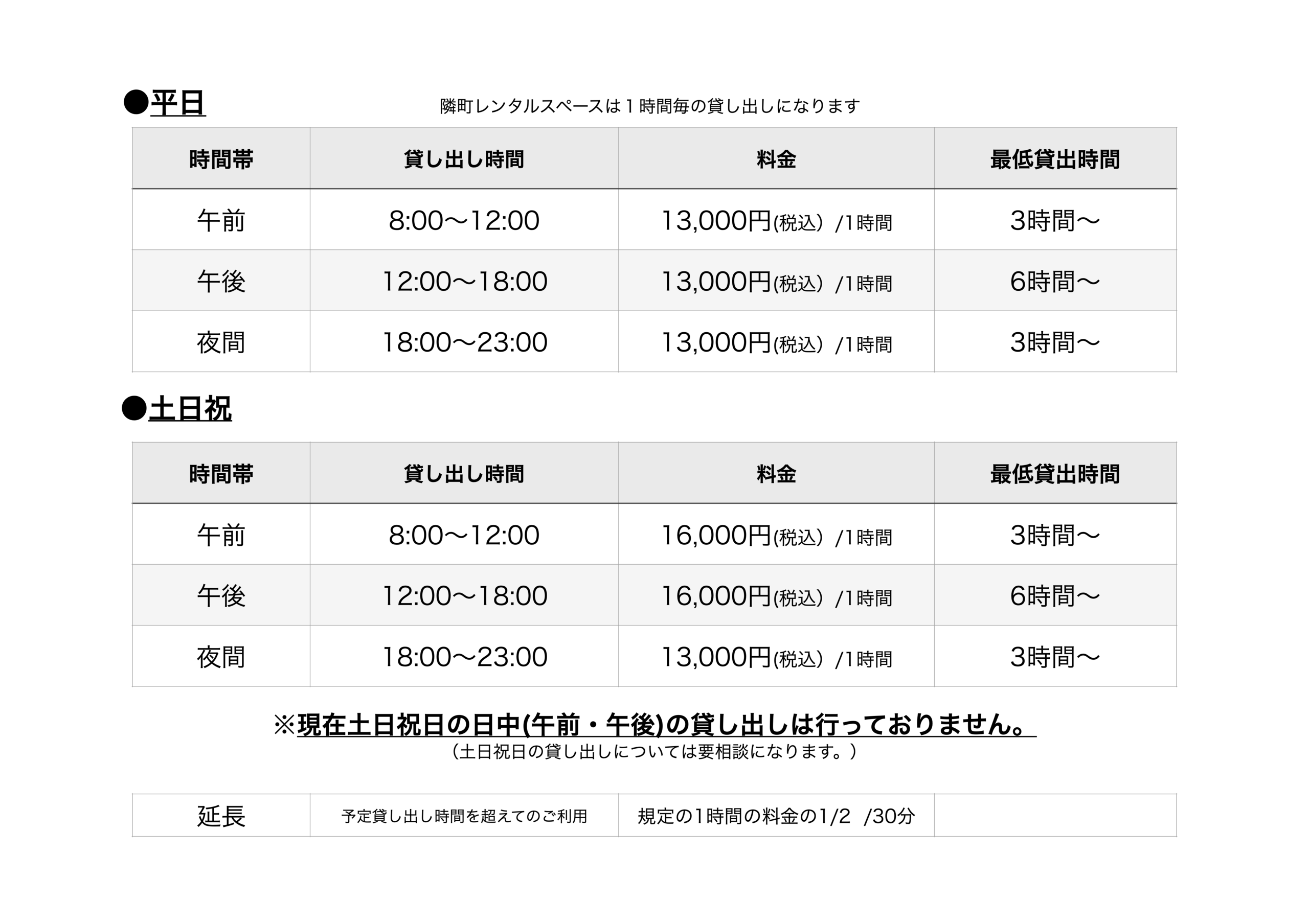 ※午前の部と午後の部をまたぐ貸し出し、また午後の部と夜間の部をまたぐ貸し出しの場合、最低6時間からのご利用になります。