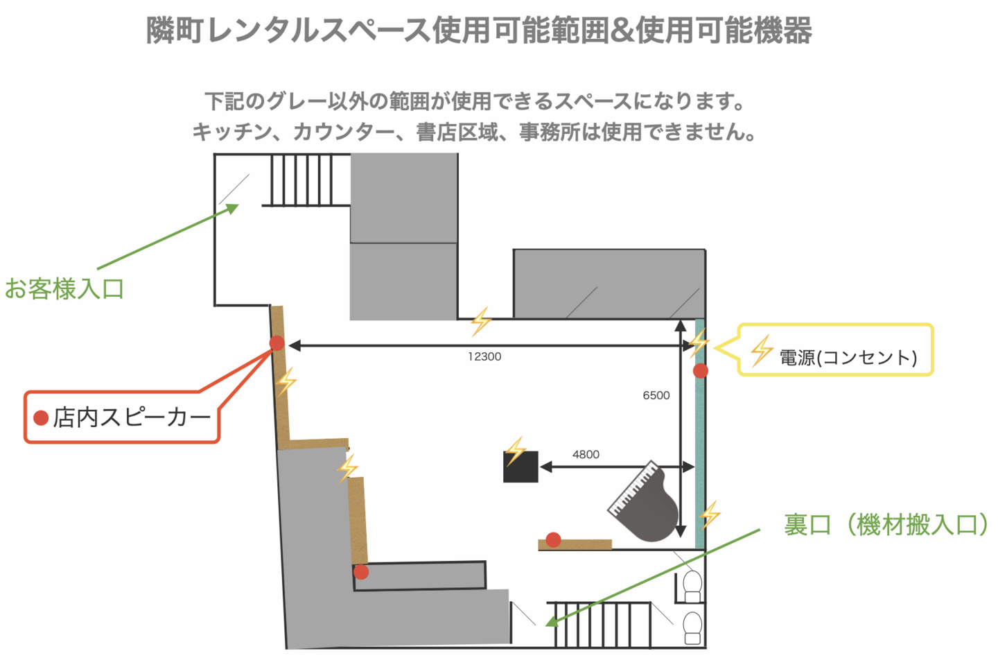 ・貸し出しは時間制になります。ご準備・撤収等のお時間も貸し出し時間に含まれますので、余裕を持っ